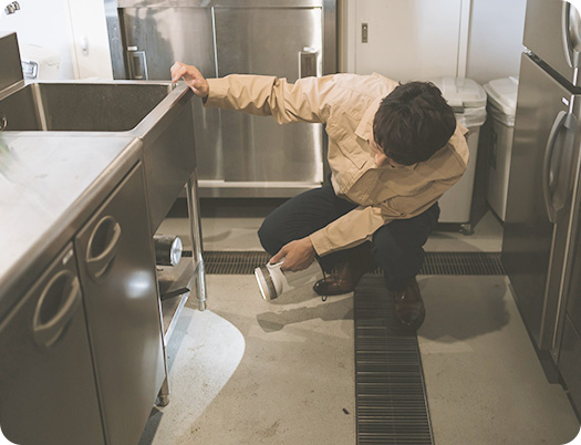 店舗内外の環境や動線を調査し、ネズミの侵入経路や潜伏箇所を特定したうえで対策を行います。長年の現場経験を持ち、侵入経路を見つけることに長けたスタッフが、固定されたソファーの下や壁裏、配管まわりなど、見逃されがちな箇所まで丁寧に確認します。