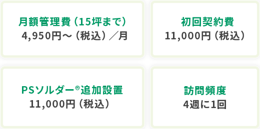 月額費用には、PSソルダー®の管理、定期点検、状況確認や必要に応じた対応などのアフターケアを含み、継続的に再発しにくい環境を維持します。